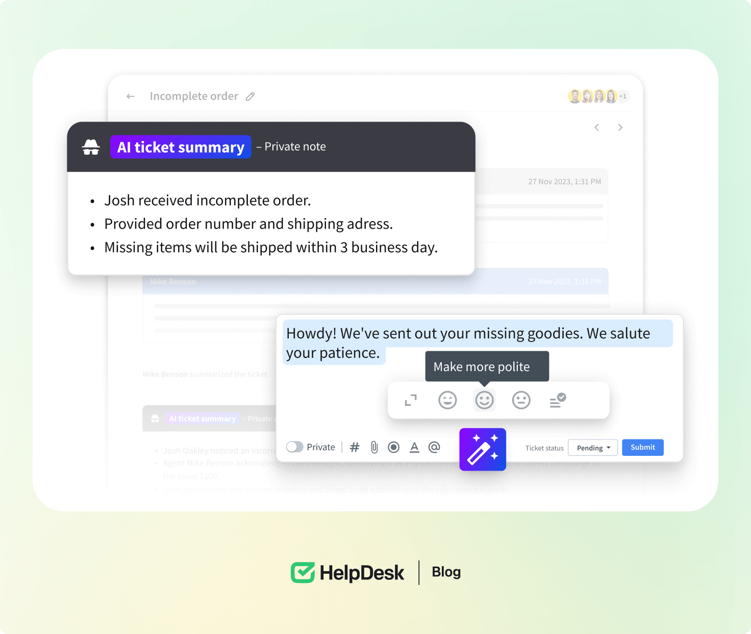 Get HelpDesk with built-in AI features such as ticket summary and text enhancements to make your work quicker and more efficient 💨