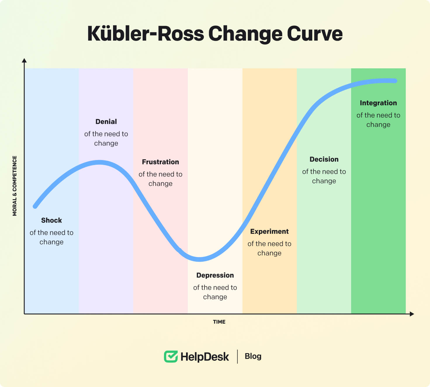 The Kübler-Ross Change Curve is based on the five stages of grief pioneered by psychiatrist Elisabeth Kübler-Ross in the 1960s. So, this model expands on these stages to describe employees’ emotions when going through a change.