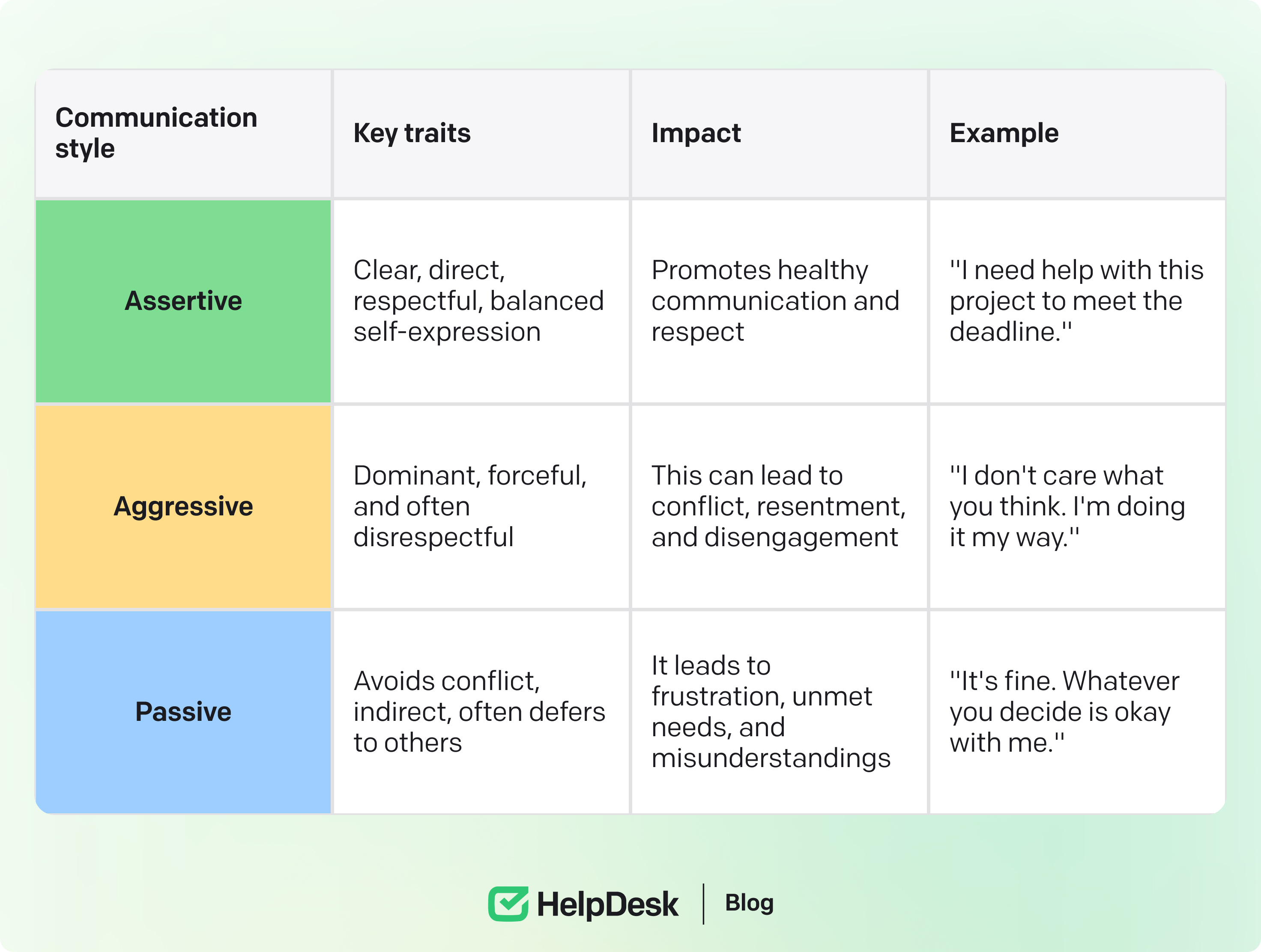 Also, when body language or tone doesn’t align with their thoughts, others may misinterpret passive communicators’ intentions or assume they have no strong opinions.