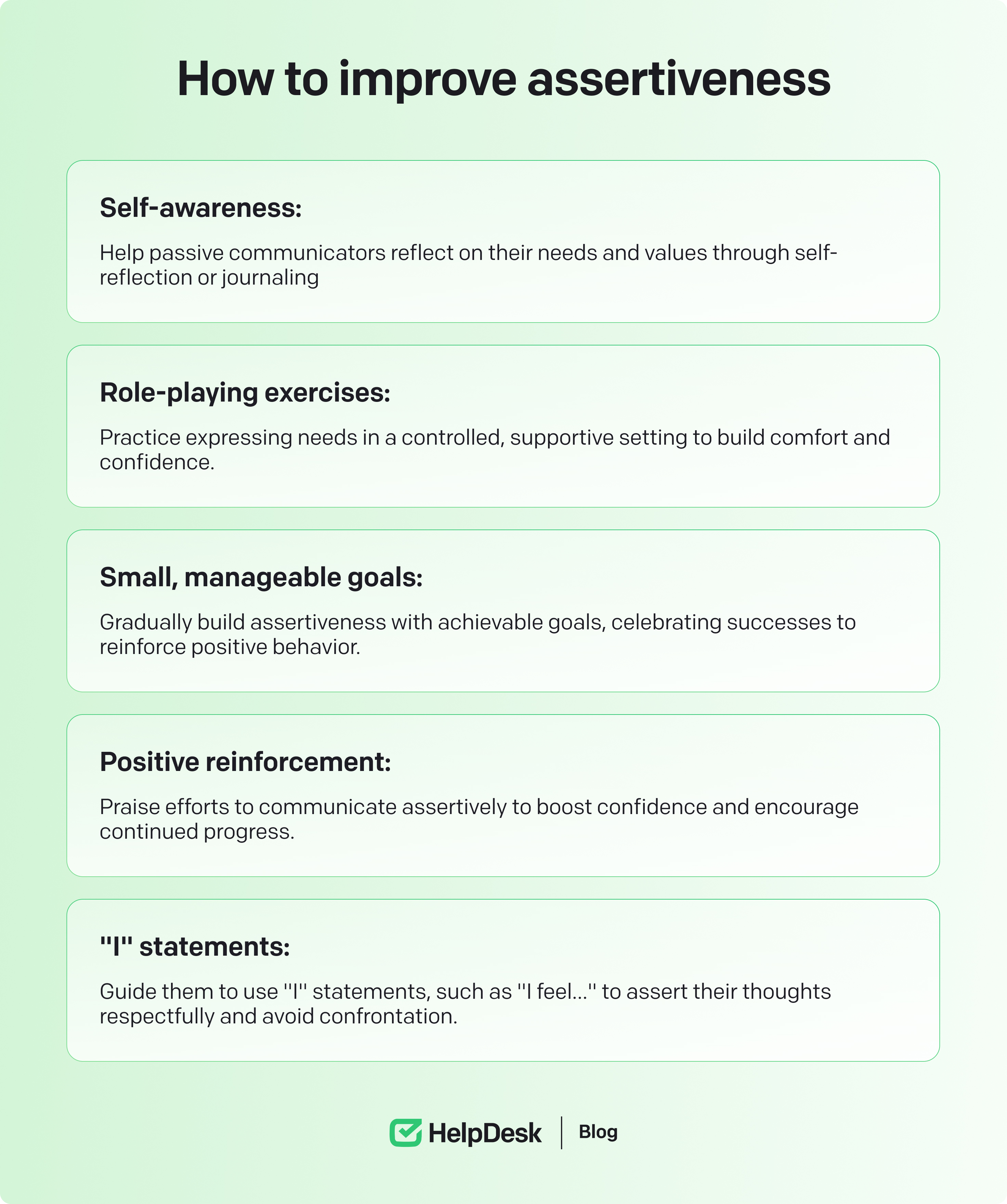Building assertiveness in passive communicators can improve their confidence, relationships, and overall interaction satisfaction. In addition to passive and aggressive communication styles, the passive-aggressive communicator involves indirectly expressing negative feelings or resentment.
