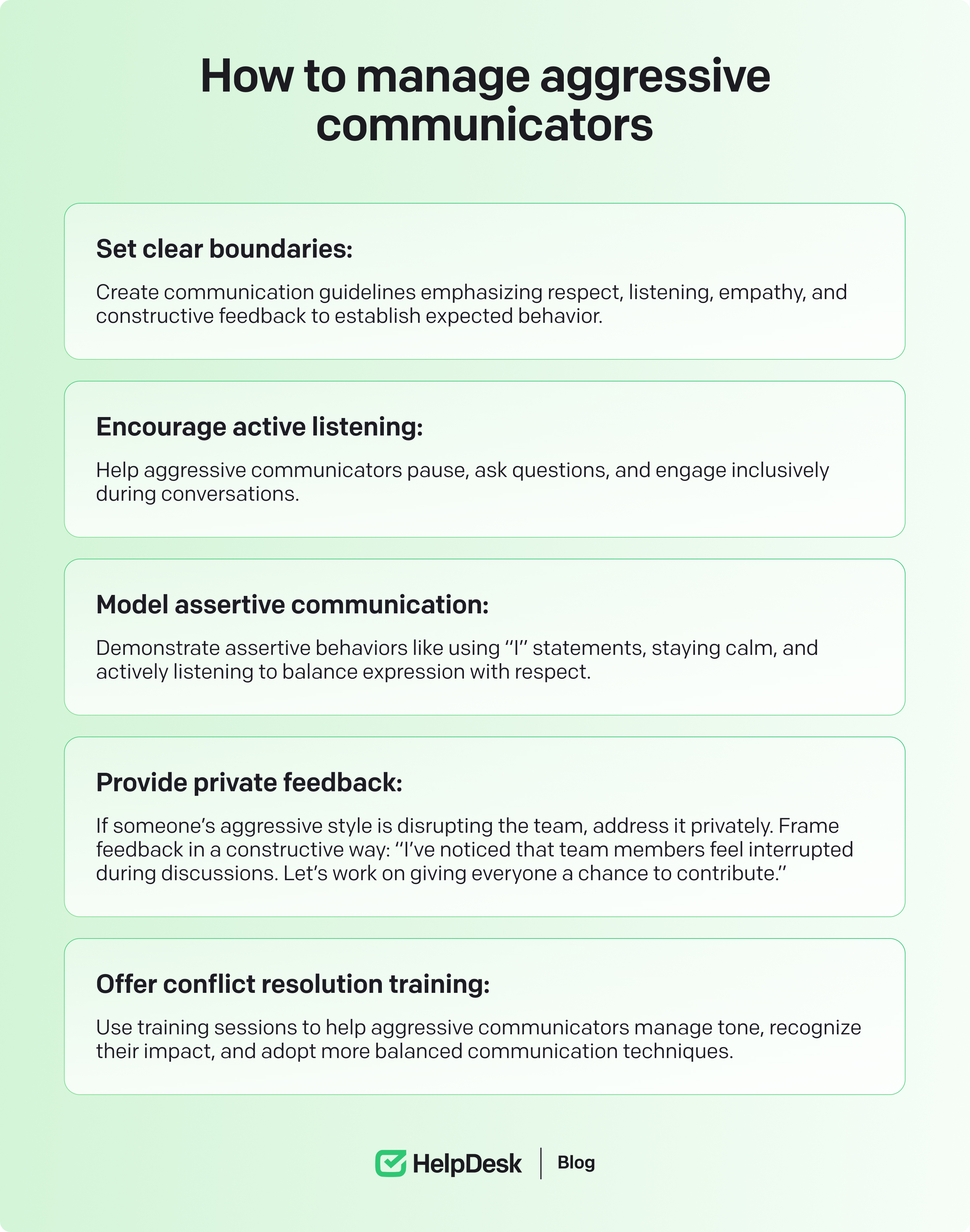While the aggressive communication style can achieve immediate goals, its long-term impact is often detrimental to team dynamics. Managing it can help create a more balanced, collaborative environment so that all team members feel valued and respected.