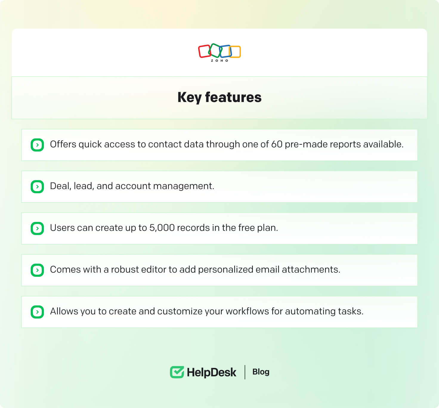 Zoho CRM is an excellent contact management software for owners looking to scale their businesses. Why? Well, its generous free plan offers integrations with some robust Zoho apps, which opens you up to many new features, all for free.