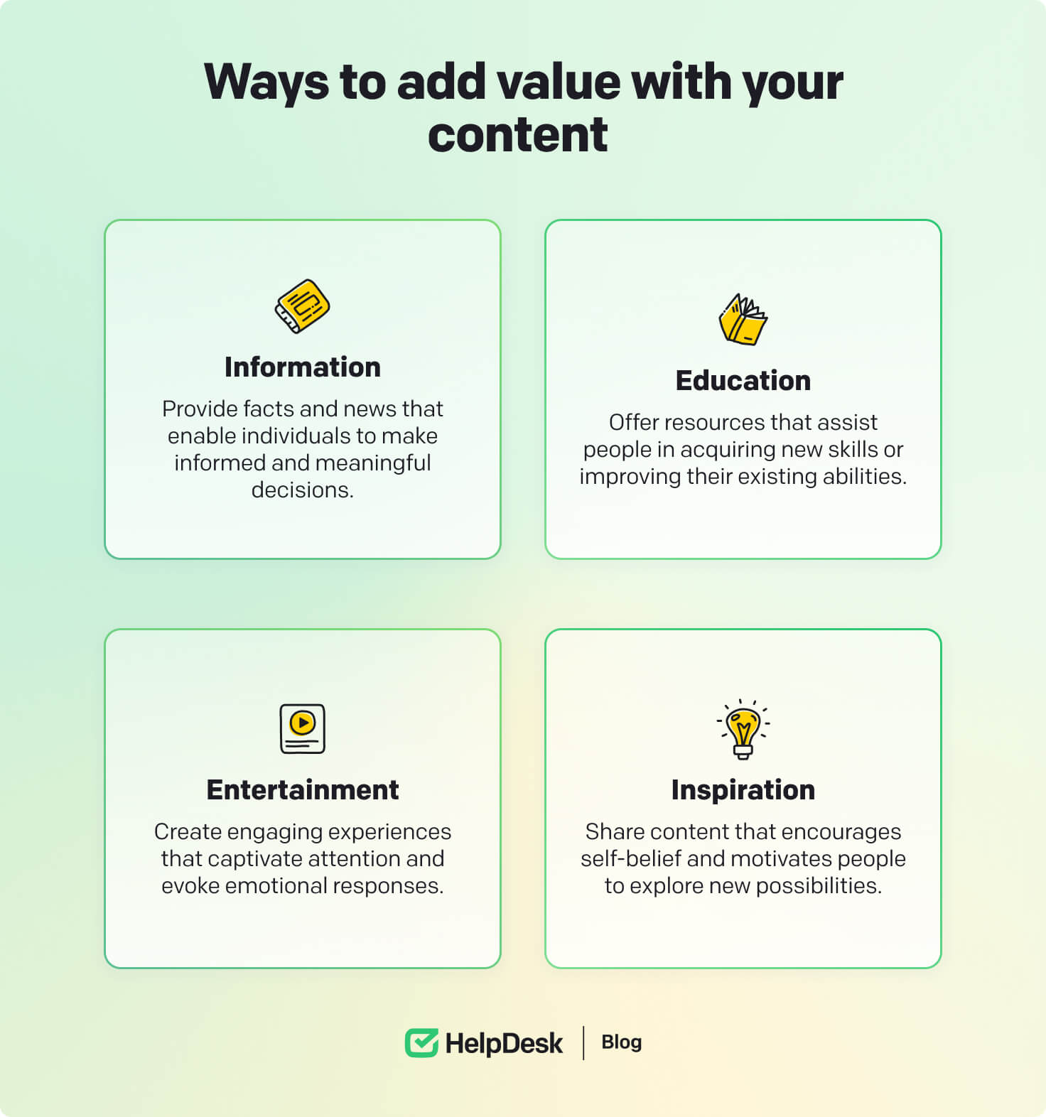 Also, try several content types: informative, educational, entertaining, or inspirational to capture the user’s attention and build topical authority in a field.