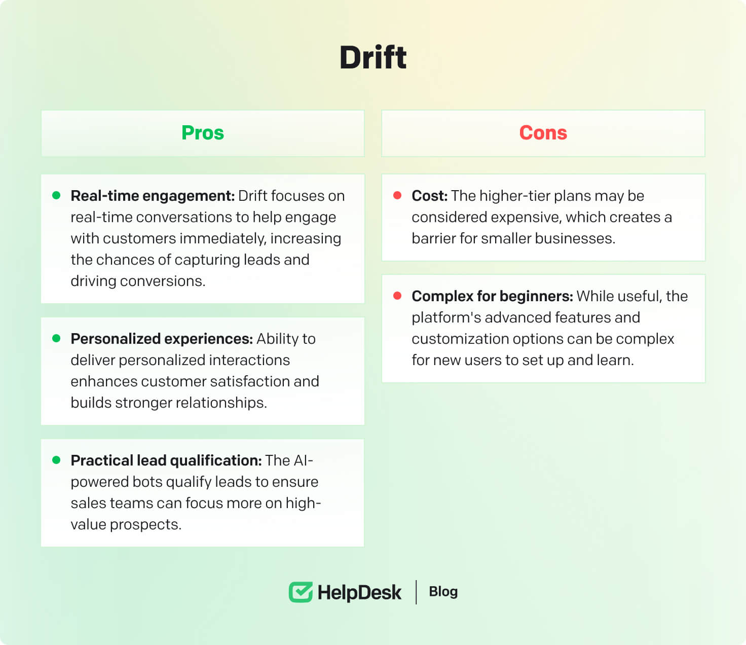Live chats and bots: Drift includes live chat and AI-powered bots that handle routine inquiries, qualify leads, and book meetings to ensure customers receive timely responses.