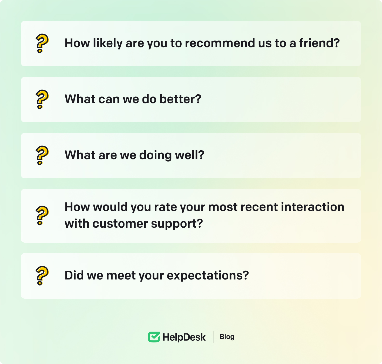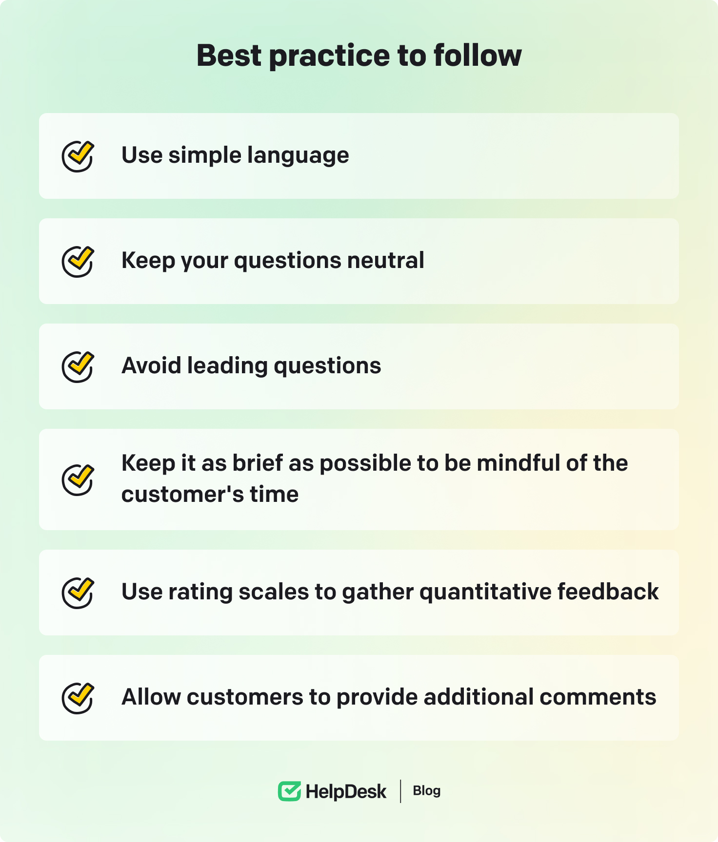 When creating your survey, prioritize open-ended questions. They allow customers to provide more detailed and specific information about the customer experience and whether you’re meeting or exceeding expectations.
