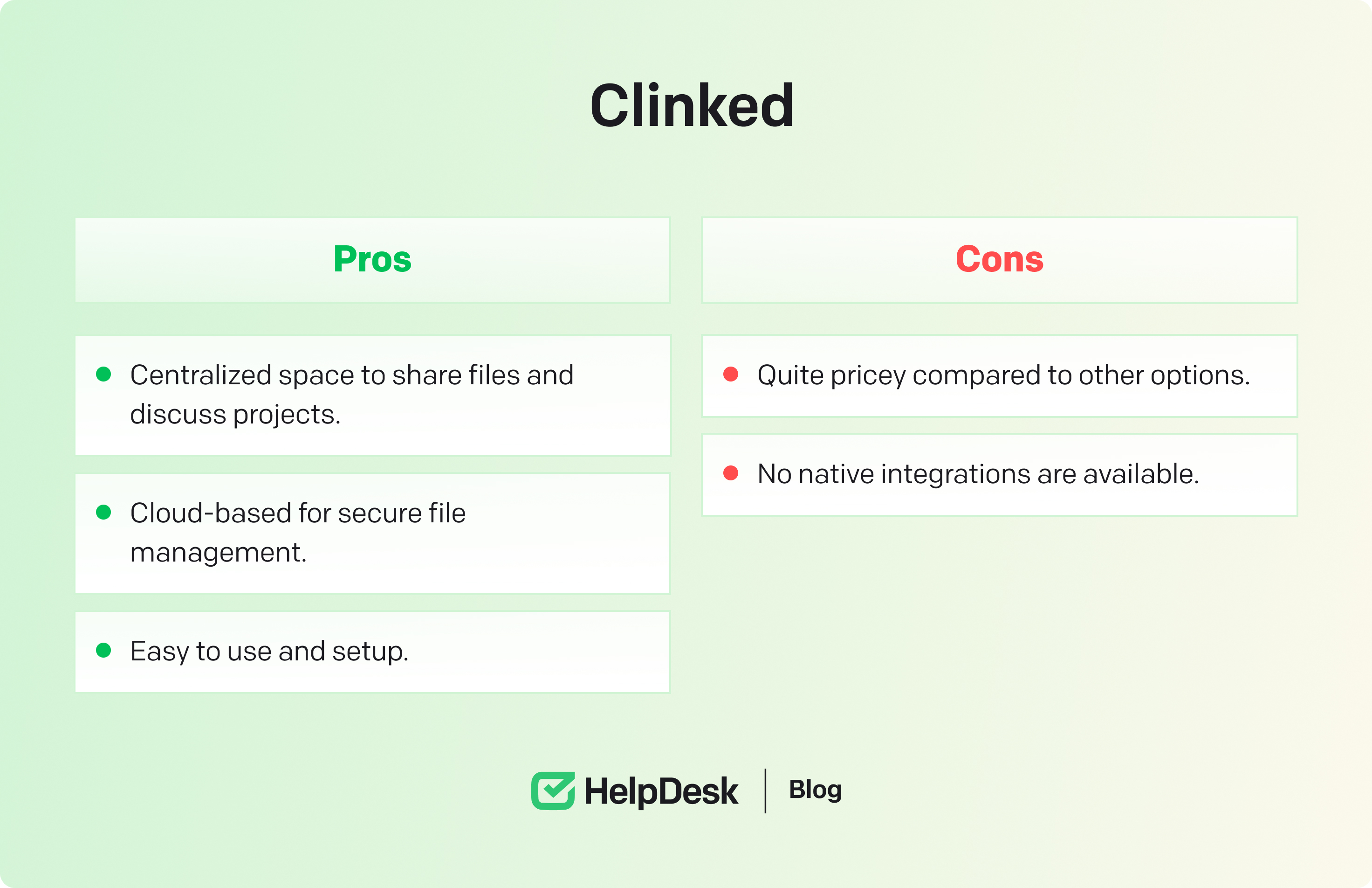 Some prominent uses of Clinked include smooth team and project management, collaboration, and client engagement. File sharing and task assigning are also a breeze with this platform.