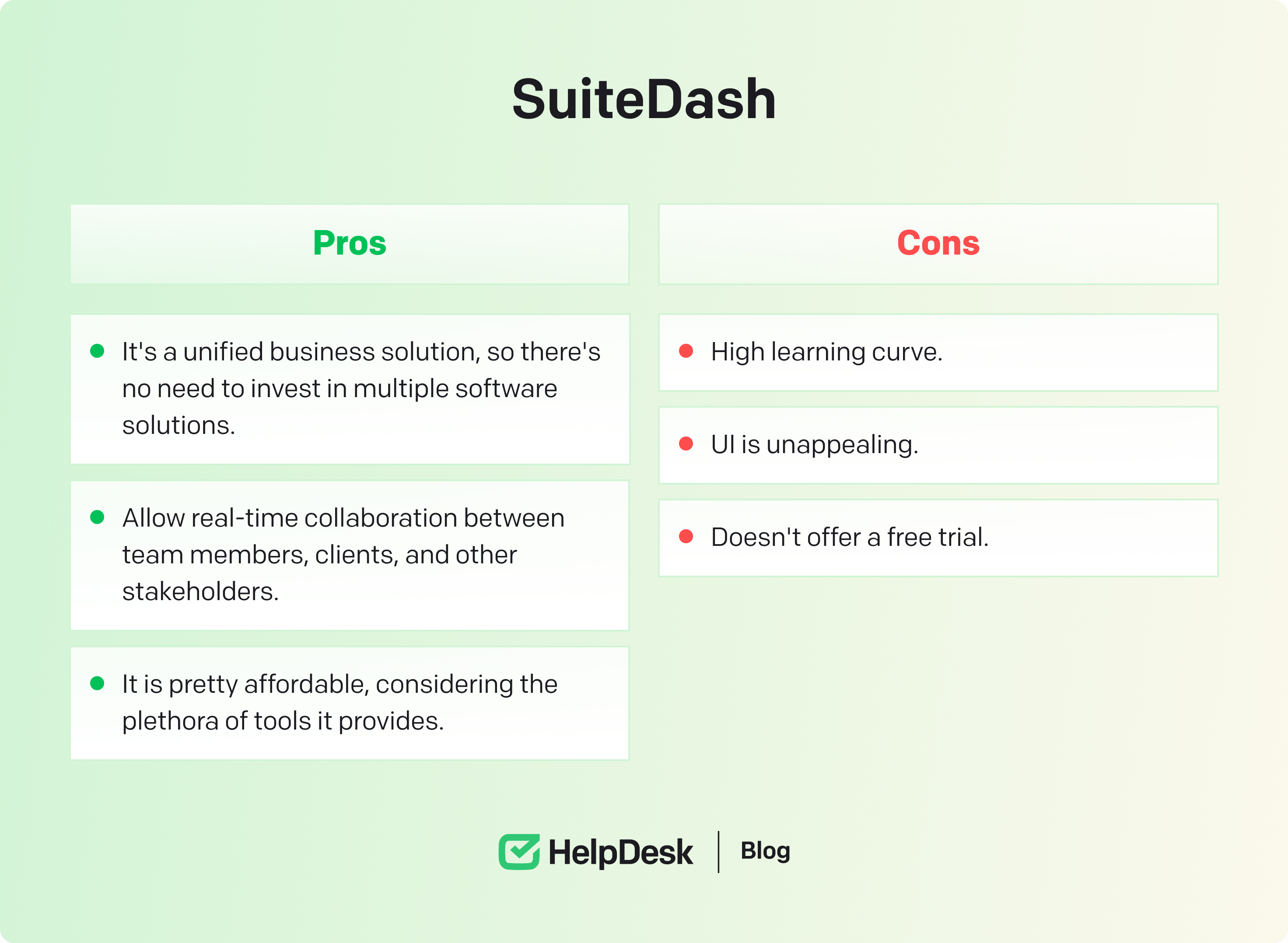SuiteDash is a comprehensive business management platform with many tools, such as a client portal, project management, CRM, and invoicing. The client portal is quite efficient and enables you to revamp the look of your customer interactions by adding logos and changing colors. Clear reporting and tracking tools provide insights into customer interactions for better and timely issue resolution.