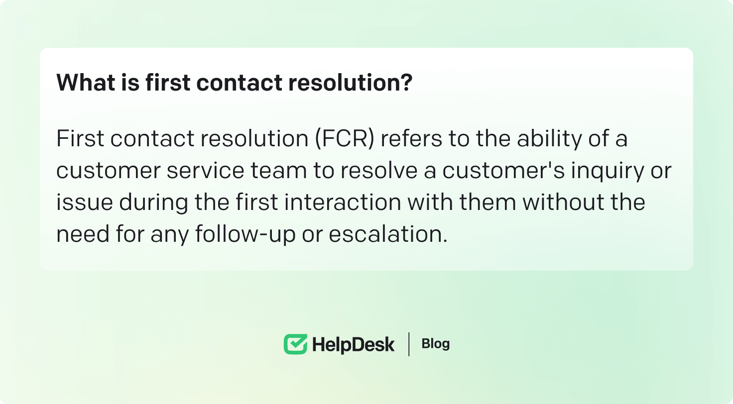 First contact resolution (or first call resolution) is a customer satisfaction metric that tells the percentage of inquiries resolved in first contact or try. It’s the ability of the customer service team members to address and resolve a customer’s issue during their initial contact with the company.