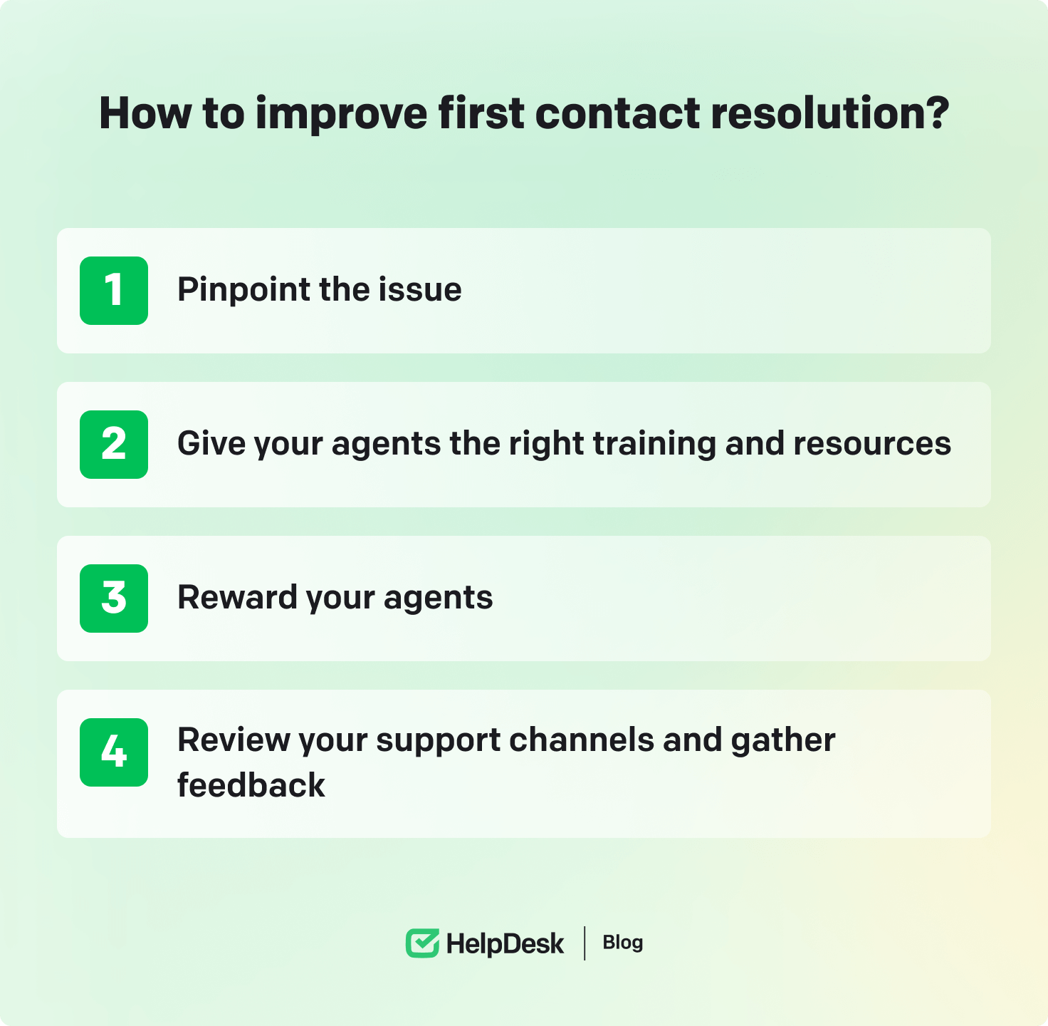 The first step in improving the FCR rate is to pinpoint your issues. Find out why call center agents aren’t achieving first contact resolutions consistently. This may involve analyzing call logs, customer feedback, and agent performance metrics to identify common challenges or recurring problems.