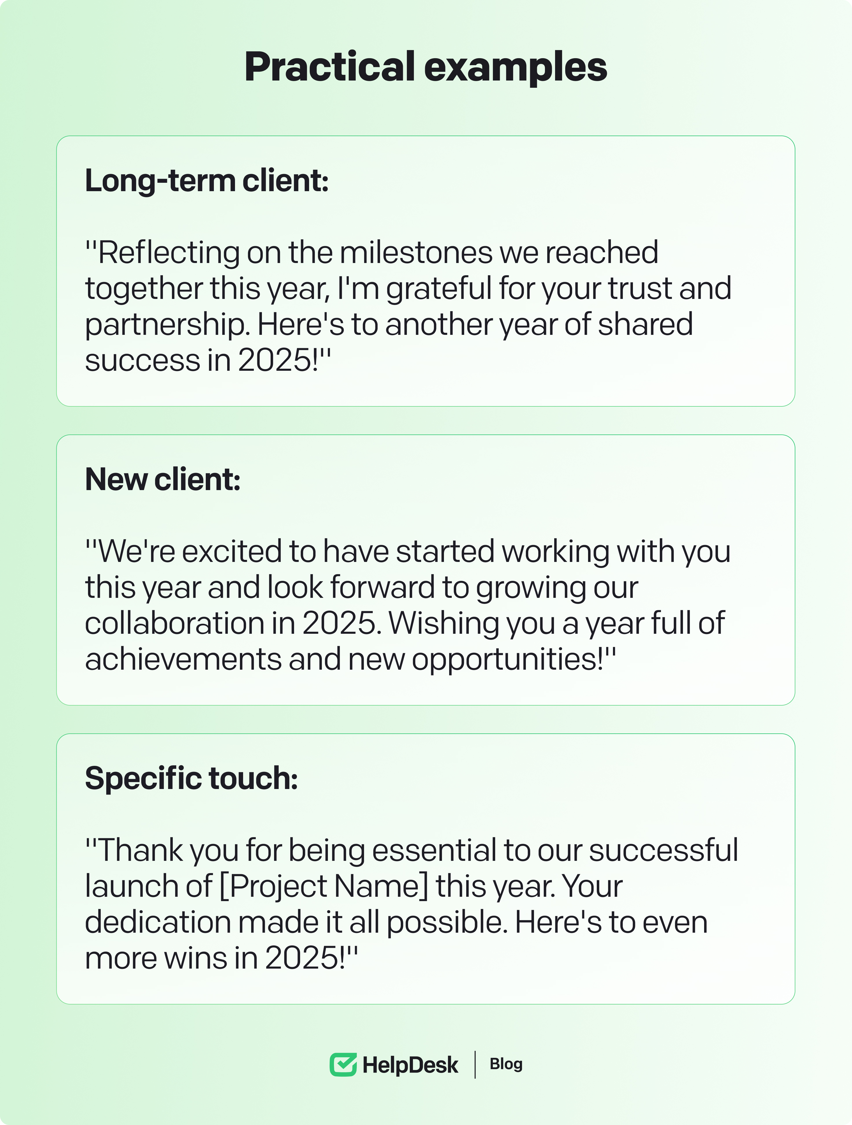Avoiding generic messages: Generic messages can blend into the sea of other greetings your clients receive. Customizing your wishes with personal touches or specific references makes your communication stand out and shows you value your relationship. Mentioning a shared success or expressing excitement for upcoming projects signals that you put thought into the message, reinforcing trust and strengthening your connection.