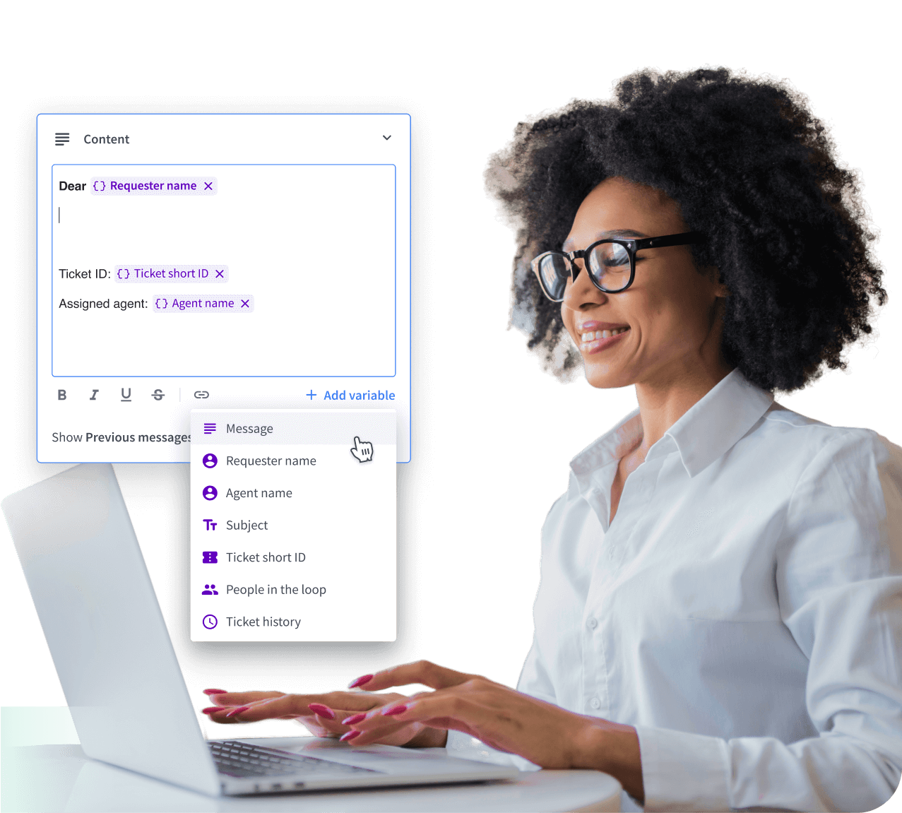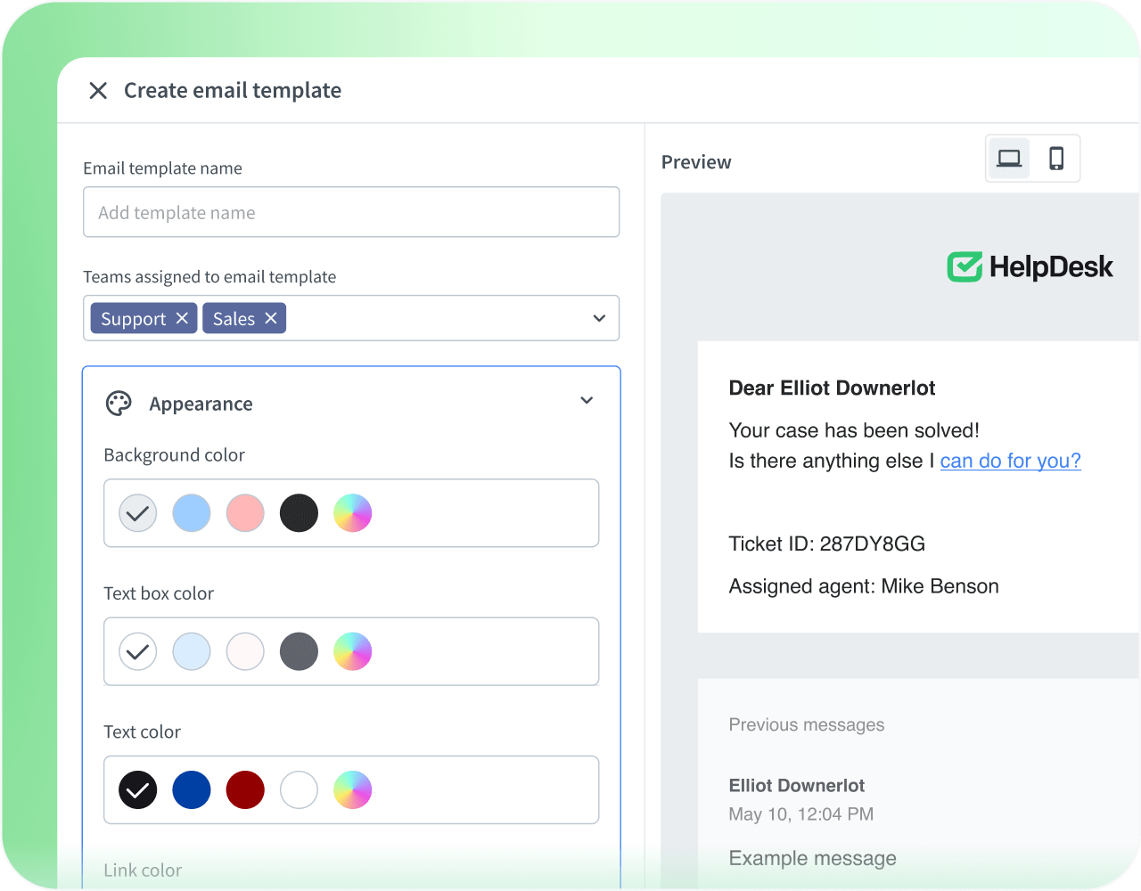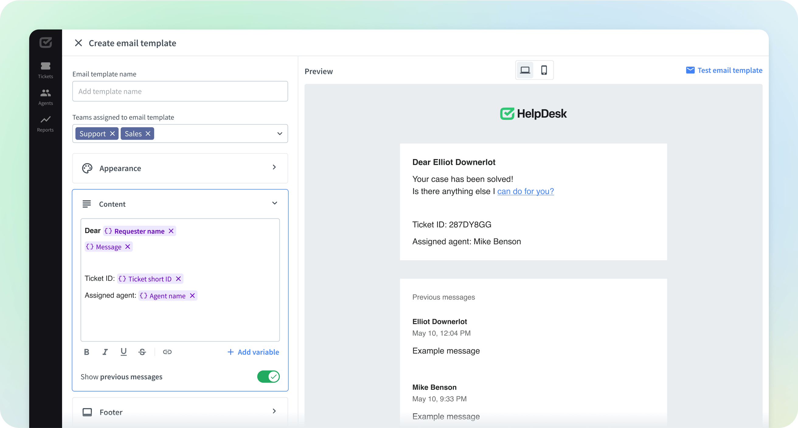 Use six possible variables that pull in the data you include in your ticket details. Make your email templates even more informative.
