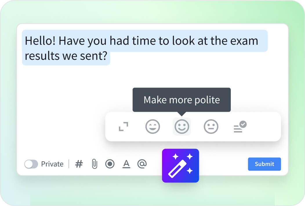 Craft clear messages for students and teachers. Enable professors to automatically enhance their replies, making them more comprehensive and informative, and improve the quality of support they provided.