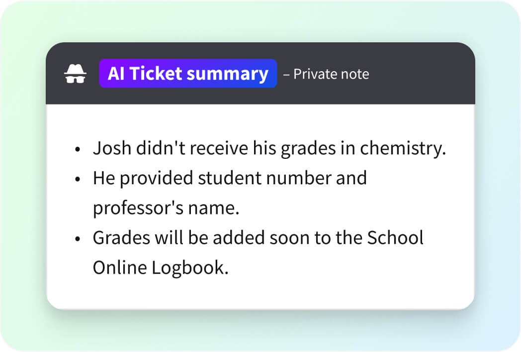 Use the ticket summary feature to swiftly provide concise overviews of students’ tickets. Enhance the efficiency of professors by allowing them to quickly grasp case details.