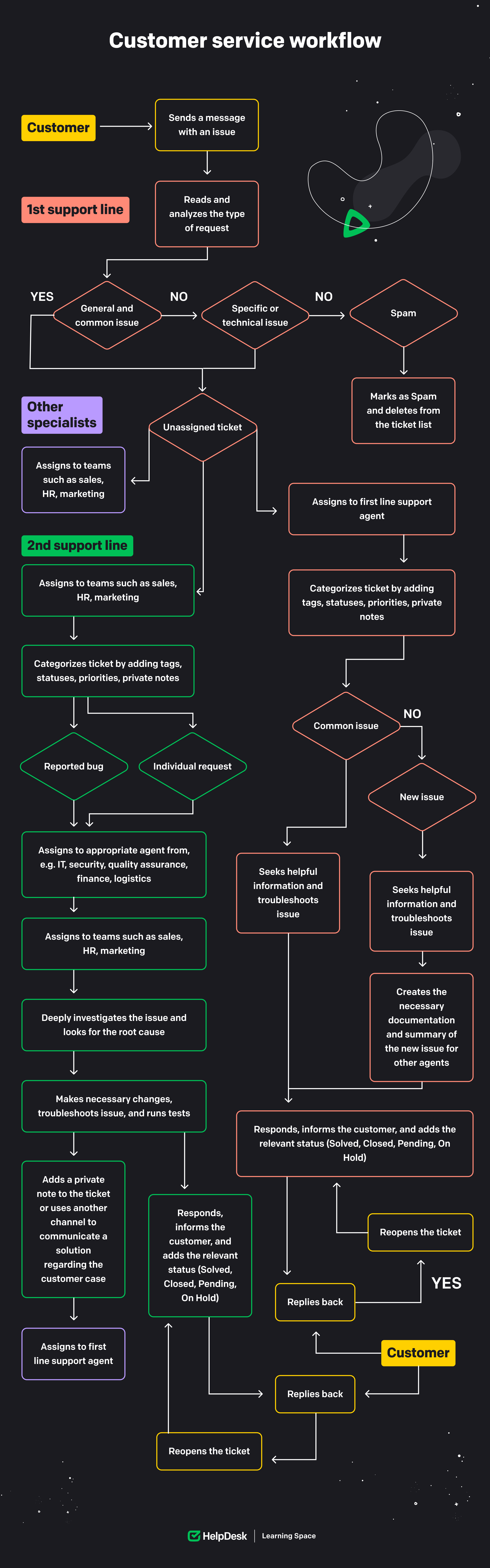 As you already know from the previous lesson, customer service is divided into first and second lines. All employees must work together and be aware of the steps in the customer service process. For this reason, it’s an excellent idea to have a customer service workflow chart on hand to inform new and senior employees of the procedures in place.