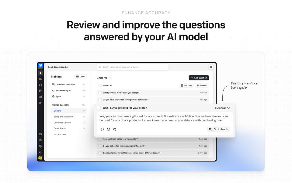 Create chatbots in minutes with diverse templates and automate key tasks right away. Easily drag-and-drop new elements to adapt any template to your needs. ChatBot is ready to work out of the box, while AI algorithms help you improve responses over time.
